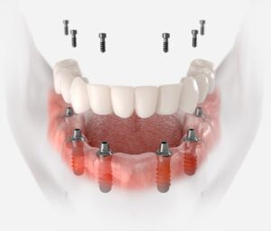 Όταν είναι απαραίτητη η αποκατάσταση όλων των δοντιών μίας ή και των δυο γνάθων, τοποθετούνται τουλάχιστον πέντε εμφυτεύματα σε κάθε γνάθο για να στηριχτεί μια ακίνητη προσθετική εργασία.